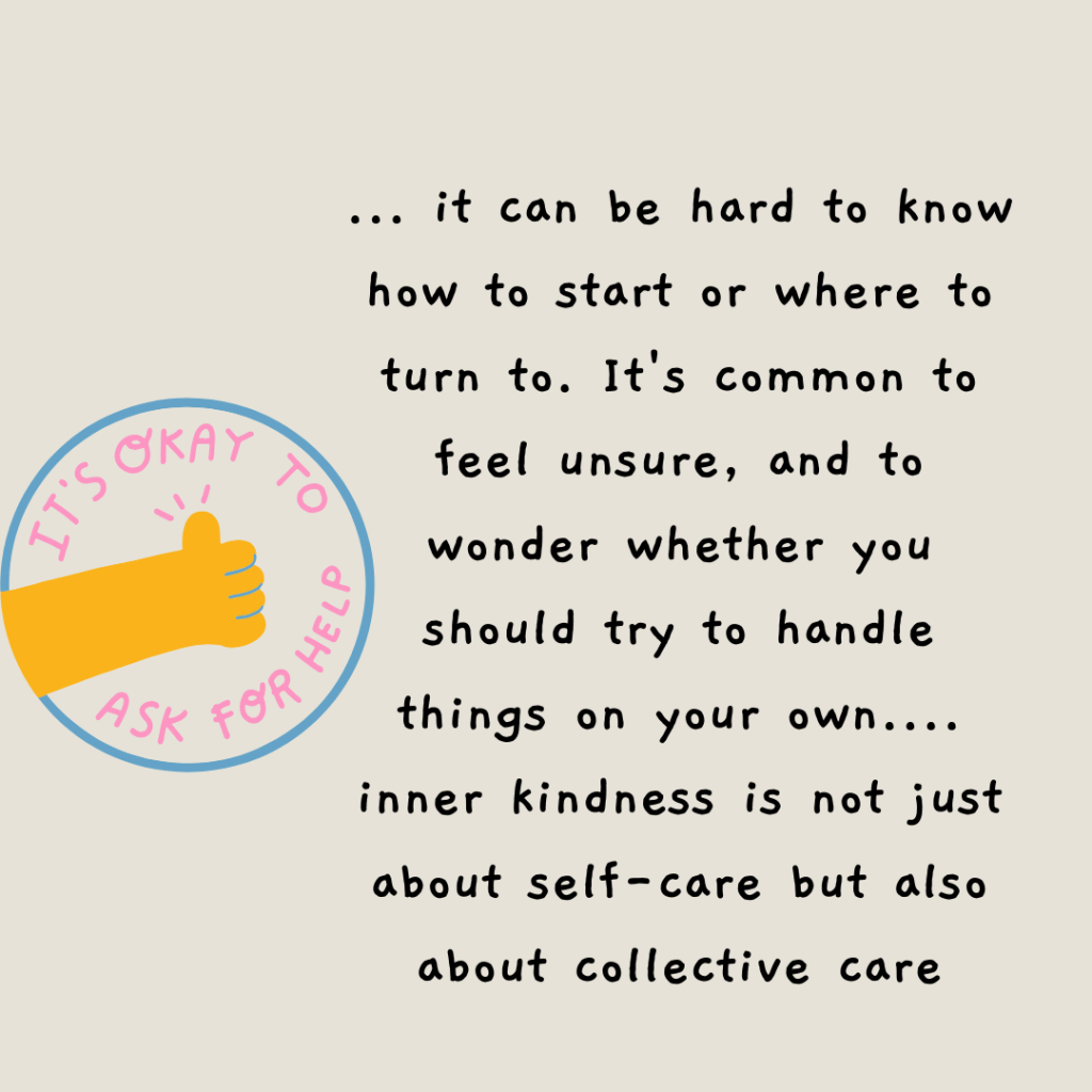 Write down one thing you can do that is a piece of collective care – seal your card in an envelope and hand it in with your address on it, this will be posted out to reminding you of how you have set out to cultivate inner kindness.