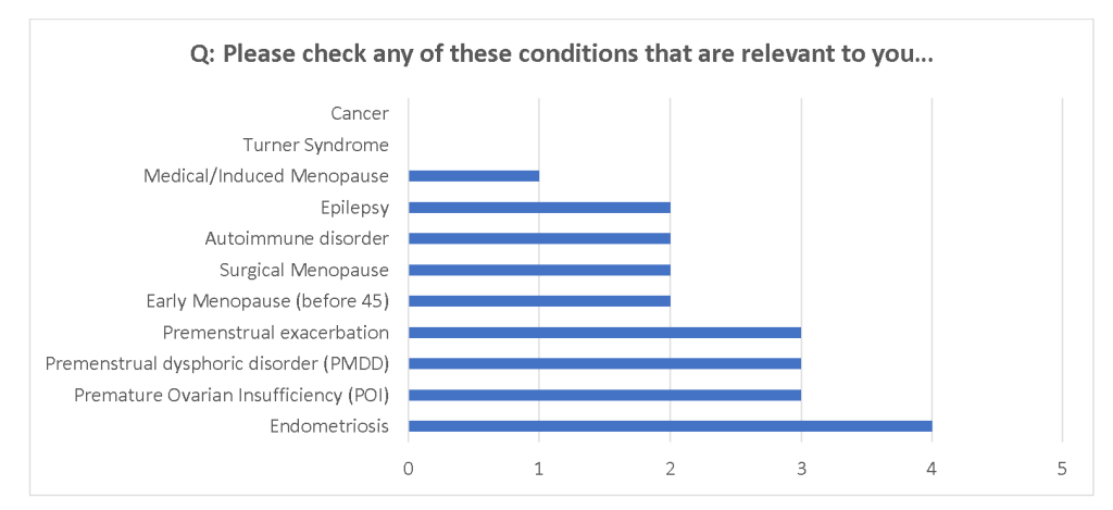 Twelve respondents (40%) identified with conditions that are widely recognised as making the experience of the menopause transition more difficult (see the next chart). We recognise that the people completing this survey are those likely to be experiencing these conditions more intensely, looking at the number of people under 50 (the average age for menopause) that are engaging we can see many have identified with POI or early menopause, or surgical menopause, they also have co-morbidity with underlying causes such as epilepsy and autoimmune conditions.