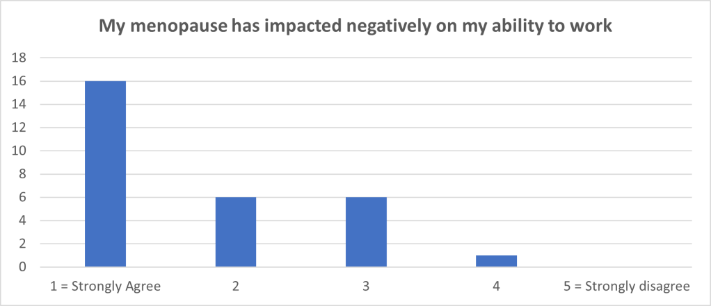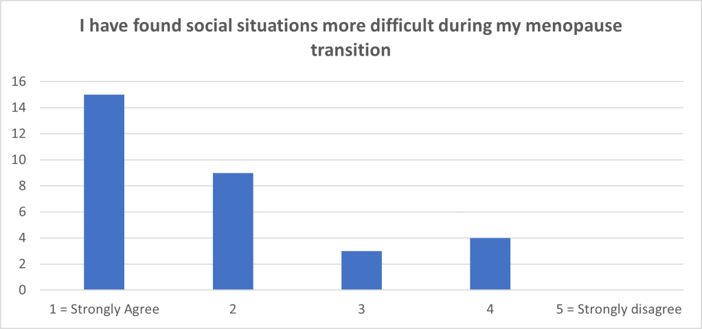 The majority of respondents (78%) agreed or strongly agreed that menopause had impacted negatively on their ability to work. Over half (56%) agreed or strongly agreed that menopause had impacted negatively on their family life and 80% agreed or strongly agreed that they had found social situations more difficult during their menopause transition. 83% agreed or strongly agreed that they would like more mental and emotional support during their menopause transition, with only 1 person agreeing or strongly agreeing with the statement that they had easy support to mental health issues around menopause. When asked what they had tried in relation to easing menopause symptoms the majority of respondents had tried exercise (78%), HRT (74%), vitamin supplements (74%), meditation or mindfulness (70%), dietary changes (63%) and natural remedies (51%).