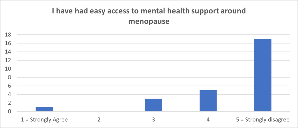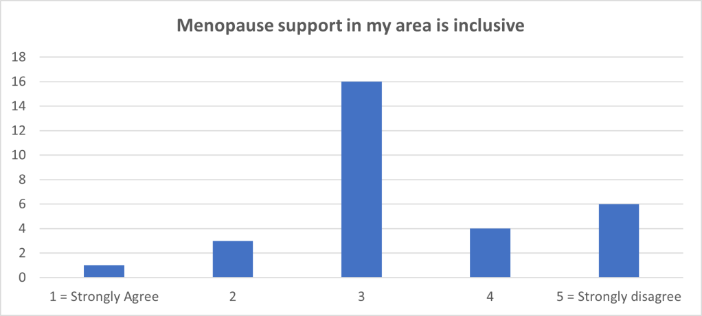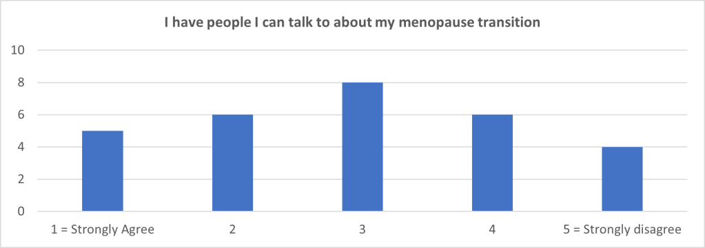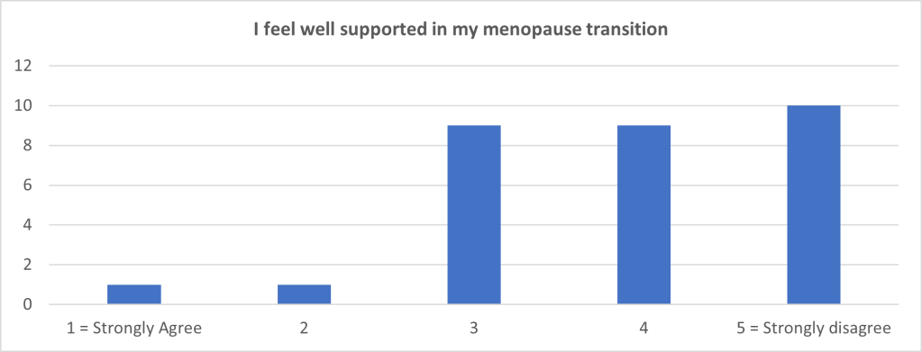It seems significant overall that only 2 respondents (7%) agreed or strongly agreed with the statement that they feel well supported with their menopause transition and only 37% of respondents agreed or strongly agreed that they had someone they could speak with about their menopause transition. Only 3 respondents (10%) agreed or strongly agreed that menopause support in the local area was inclusive, there needs to be more research to unpick what this means. 78% indicated they would like more support with their mental and emotional wellbeing.