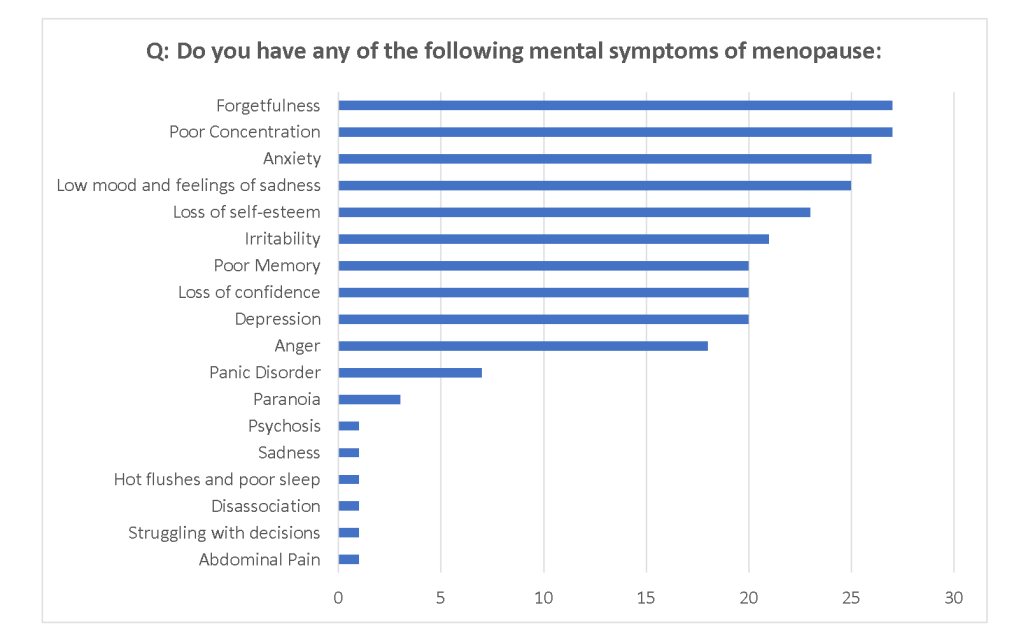 When asked about which mental symptoms of menopause they experienced respondents identified multiple negative experiences, with 90% experiencing forgetfulness, 87% experiencing anxiety, 90% poor concentration and distraction, 83.3% experiencing low mood and feelings of sadness, and 67% identifying this as depression.