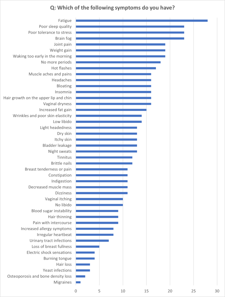 When asked about physical symptoms, most respondents identified fatigue (93%), brain fog (77%), poor tolerance to stress (77%), poor sleep quality (77%), weight gain and joint pain also ranked highly (63%). Over half of respondents noted a cessation of periods (60%), hot flushes (57%), vaginal dryness (53%), insomnia (53%), bloating, headaches (53%), and muscle aches and pains (53%). It is worth noting that these and the many other physical symptoms have an impact on mental wellbeing.