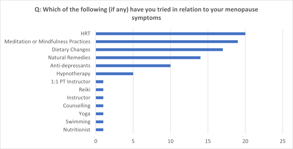 The methods tried for symptom relief varied but leaned towards a holistic approach, including lifestyle change, exercise, and dietary changes, and many found medical interventions like Hormone Replacement Therapy (HRT) incredibly helpful. It is clear from the feedback that many identified solutions have been outside of the NHS and privately paid for.