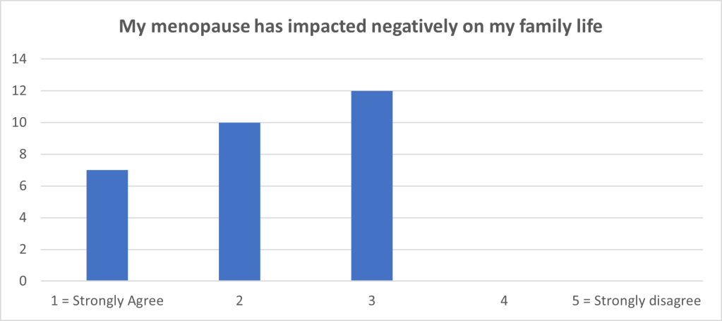 The responses to the question about the impact of menopause on individuals’ lives reflect a range of significant challenges and negative effects. Many describe a profound negative impact on various aspects of life, including relationships, work, and overall well-being. Common themes include tiredness, sleep disturbances, anxiety, depression, and a diminished ability to enjoy life, with some feeling suicidal. Participants mention difficulties in maintaining productivity, struggles in personal relationships, and the isolation experienced due to the lack of understanding or belief from others about their menopausal experiences. Some express feelings of devastation, loss of confidence, and a sense of being overwhelmed. For some this has also been a time of ‘unmasking’ around ADHD and ASD symptoms becoming unmanageable, with some having a recent diagnosis of these conditions.