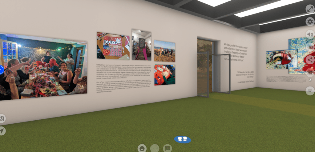 As part of this project, we created an online metasteps space where people can convene, and view in a 3D online space representing some creative elements from the project at any time. You can click this link with or without a login and see the site! You will find the Menopause and Mind resources as part of the information in the third chamber of the space: